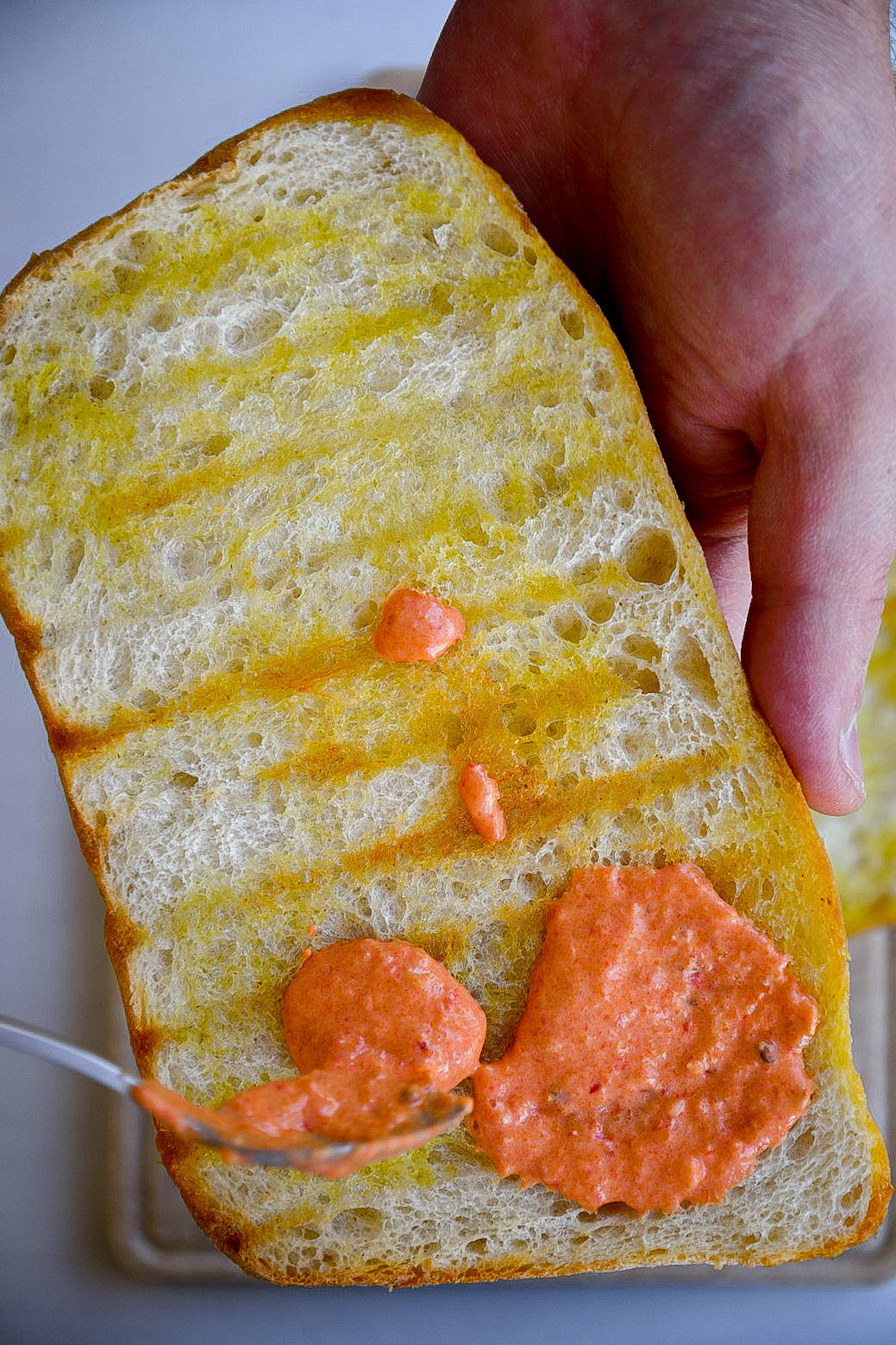 Шаг 1: Подготовка основы. Сначала слегка подрумяньте ломтики хлеба. Если у вас нет тостера, просто обжарьте их на сухой сковороде с обеих сторон до золотистой корочки. Затем одну сторону каждого ломтика густо намажьте плавленым сыром. Один кусочек хлеба сырной стороной вверх положите на тарелку — это будет основа нашего сэндвича.
