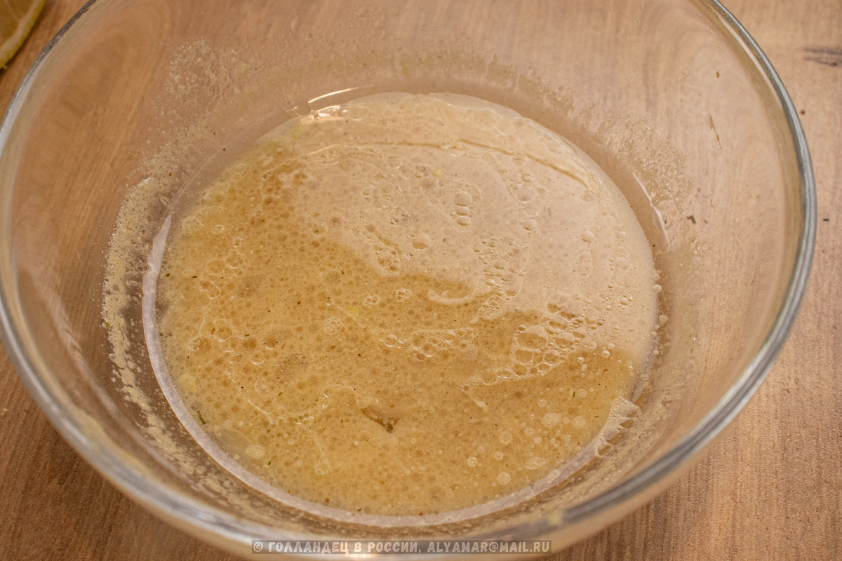 Вместо тяжёлого майонеза мы приготовим лёгкий винегрет. В небольшой ёмкости тщательно смешайте горчицу, лимонный сок и пропущенный через пресс чеснок. Тонкой струйкой влейте оливковое масло (около 100 мл), постоянно взбивая вилкой или венчиком до состояния эмульсии. Приправьте солью и перцем. Для более лёгкого варианта часть масла можно заменить холодной водой.