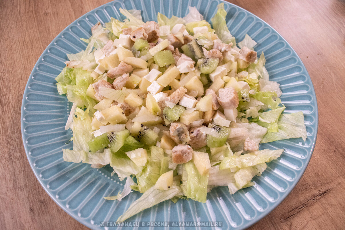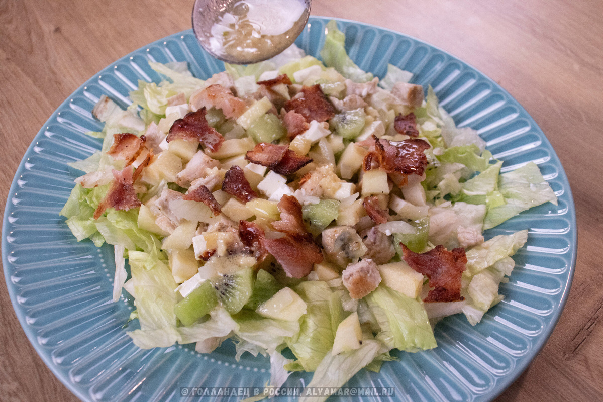 Я хочу предложить вам рецепт голландского салата, который в нашей семье стал рождественской классикой. Он не содержит майонеза, в нём удачно сочетаются сочная курица, хрустящий бекон, свежие фрукты и пикантный сыр. Это блюдо — символ домашнего уюта из моего детства, и я с радостью делюсь им с вами.